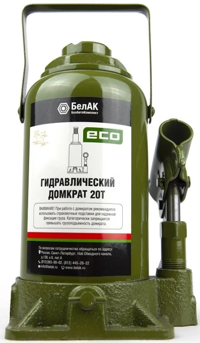 Домкрат ECO 20 тонн«БелАК»БАК.70021разработан российским производителем «БелАК», награждённым двумя национальными премиями «Автокомпонент года» и «Автоаксессуар года» за высокое качество и надежность выпускаемыхдомкратов. Продукция «БелАК» соответствуют нормам сертификации ISO9001 и ЕАС. Домкрат ECO 20 тонн«БелАК»БАК.70021 служит для плавного и безопасного подъемаавтотранспорта весом не более 20 т.
